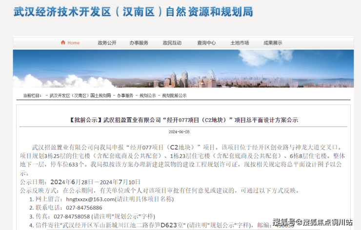 去年6月28日,经开区规划局发布了武汉招盈置业有限公司“经开077项目(C2地块)”项目总平面设计方案公示。