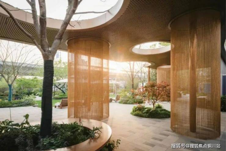 公园里的自然客厅,巧妙的将廊架与人防出入口一体化设计,圆形天井,黄铜链帘每条链帘经单独锻造与表面抗氧化处理,顶部设隐藏式阻尼旋转轴,通过长度与间距的精密计算,控制摆动幅度。