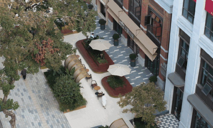 在设计之前我们先到现场感受场地的气场并且走入项目周边的现有里分社区,体验整个区域的生活氛围。我们看到的里分是一种便于邻里交流的生活空间,也是有氛围和情调的生活场景,所以我们将这些画面定格下来,并从中提取了花钵,花池,座椅、挡墙这些元素将它们通过全新的设计语言融入到我们的烟火商业街中,同时也通过提炼原有里分的色彩形成我们新街区的色调,使其达到融入环境的最终呈现。