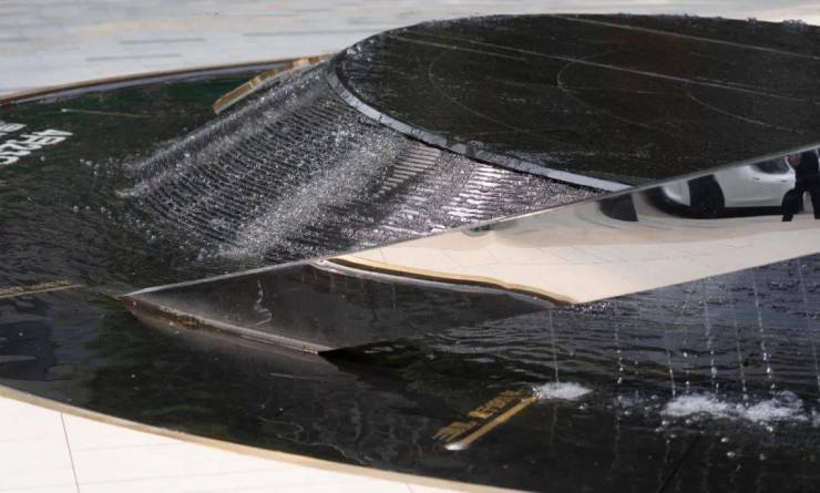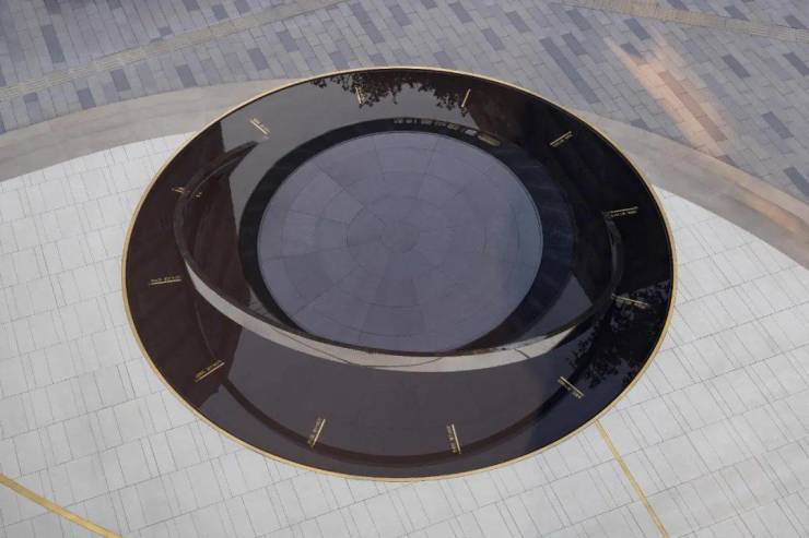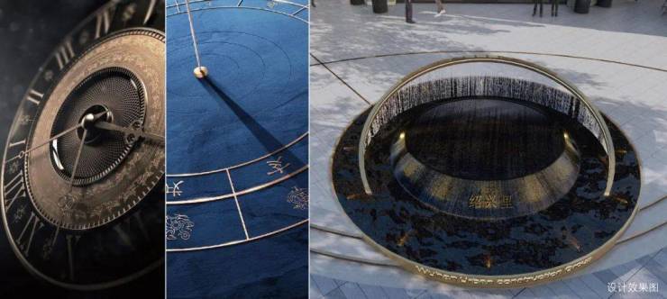 时 光之环: 在转角广场与建筑入口对应的轴线上,我们设计了"时光之环"特色水景,从钟表与日晷中汲取灵感,将环形与刻度的元素融入水景之中,研究并寻找了具有时代代表性的 12个里分社区,将这些特色里分与建造年份刻于12个刻度处,来铭记和体现时代的印迹,水景的形体构成上通过立体交织的三个圆环寓意时光的轮回与永恒。