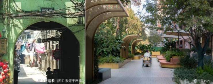 因此更新后的社区以“绍兴里1921”致敬过往,在同一片土地上,仿佛看到百年之前代表着当时此地最洋气、繁华、宜居的生活方式。如今作为城市历史文化片区更新样板,我们思考的是传承与创新,传承的是这独有的腔调与情调并存的生活,创造的是满足当代社会生活与精神需求的宜居环境,重生后的绍兴里1921由“烟火商业”与“绿洲花园”两部分组成, 沿街商业出则繁华,住区花园入则宁静,在百年之后的今天重启绍兴里这扇文化名片的大门。