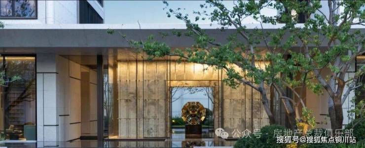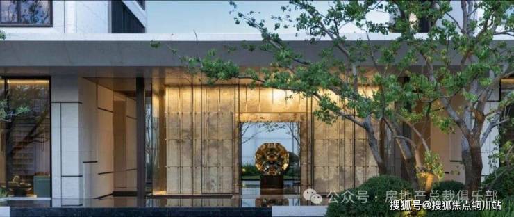铜门之内,一株树龄200多年的进口羽毛枫翩然挺立。整个门头造价高昂,虽没有华丽的炫技,但透着精致低调的雅奢感。