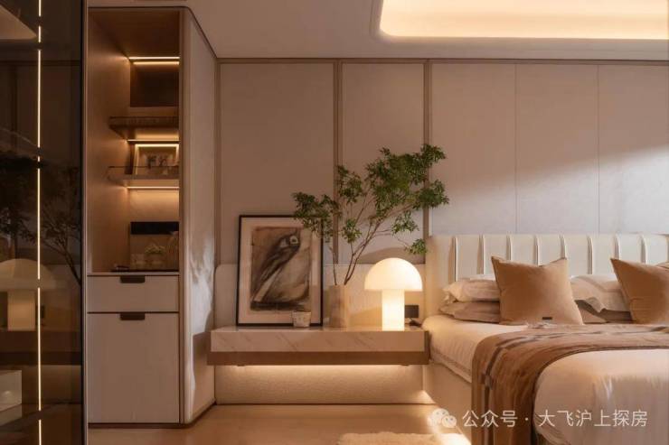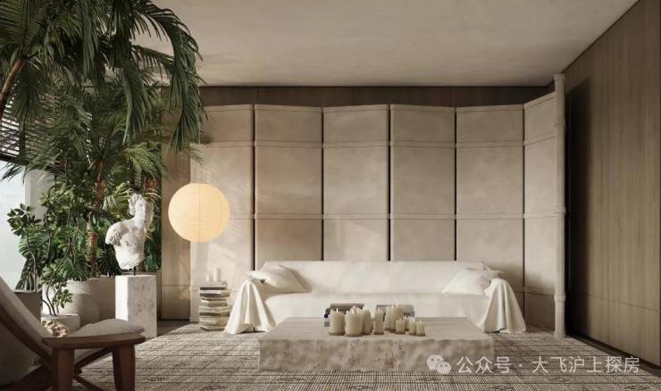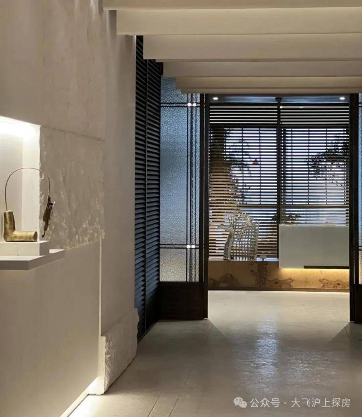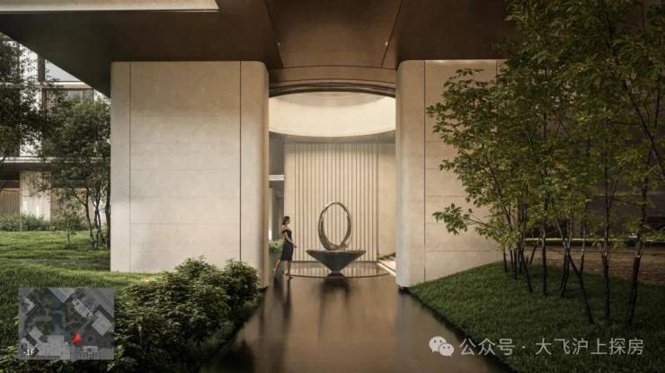 约9米净高的门廊尺度顶部挑高,南北向礼序轴与东西向精致生活轴交织形成十字转场,整个归家礼仪,在这里升华至顶点。