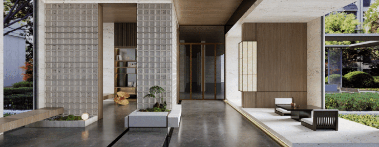即便是常被忽视的地库空间,也以星空顶入户、铝板格栅车道、水磨石地坪及岩板灯光幕墙等设计,赋予归家动线以仪式感。