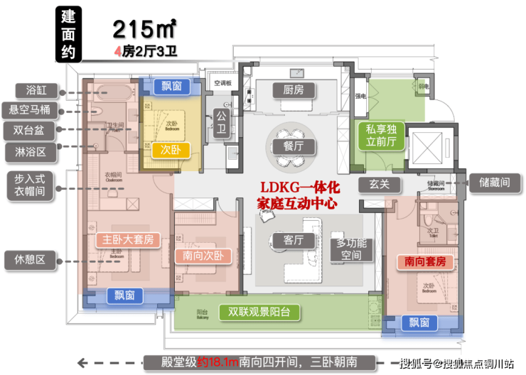 独立入户玄关,4开间朝南,开间18.1米,客厅开间约6.9米,南向双套房,三个南向卧室开间分别为3.3米、3.7米、4.2米,空间非常阔绰。