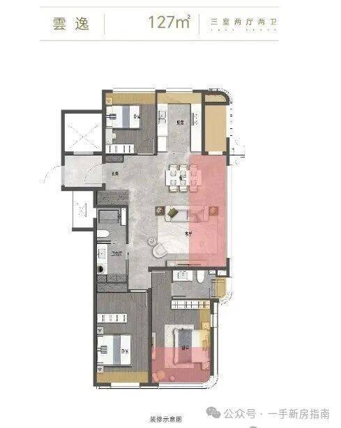 这个户型是刚需友好款!优化后得房率约 95%,空间利用率超高,完全不会浪费面积。三开间朝南,客厅带飘窗,采光和通风都不错。动静分区设计得很合理,卧室在里面,客厅餐厅在外面,朋友聚会也不会打扰家人休息。主卧是套间设计,带独立卫生间和衣帽间,私密性拉满。厨房是 U 型布局,洗切炒动线流畅,小夫妻或者三口之家住刚刚好,性价比超高~
