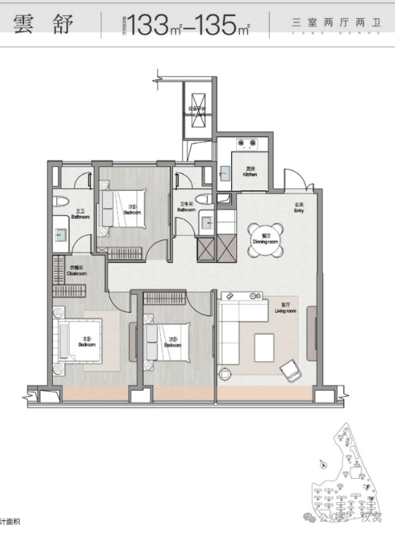 南向双阳台,一个用来晾晒,一个用来观景,实用性和观赏性都兼顾了。主卧套间带独立卫生间和大衣帽间。这个户型性价比很高,能满足全家庭的居住需求,一步到位不用换房。