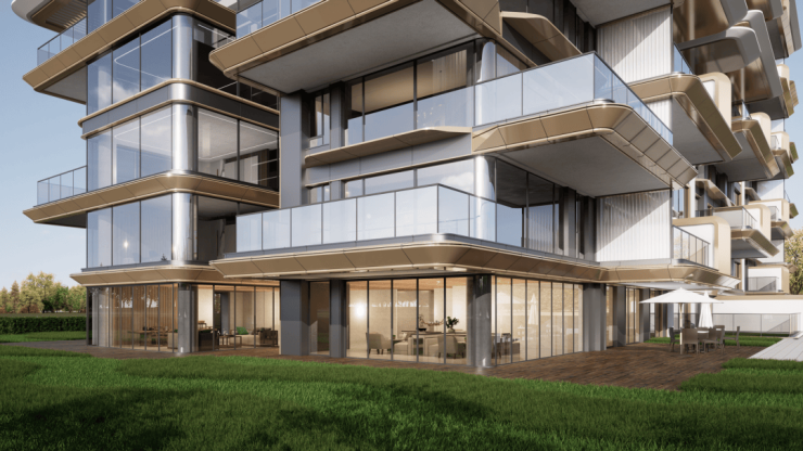 峯境叁號院的建筑立面设计调性别具一格,整体呈现晶莹轻盈、未来感十足的游艇美学外立面,理念致敬全球建筑大师扎哈·哈迪德的迪拜四代顶豪The Alba,双浮岛大露台+客厅主卧双弧度转角的设计拥抱生活希冀的徐徐风景,珠光古铜色铝板和玻璃幕墙是主要材质,结合深灰色铝板、银白色铝板,勾勒出顶级豪宅品质的立面美学。