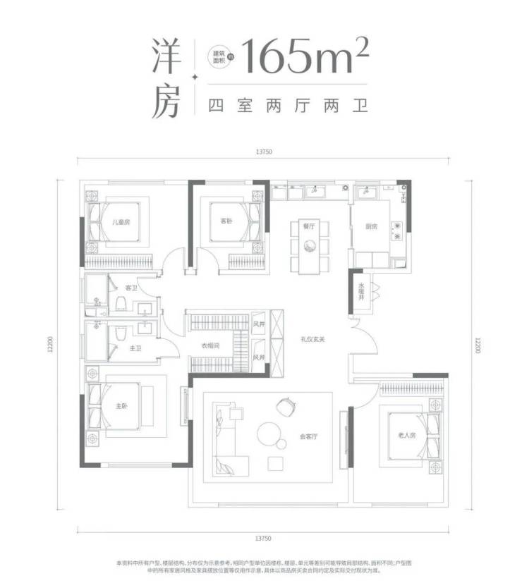 配有独立玄关,体现尊贵感同时兼顾收纳,采用客厅、餐厅、厨房一体化的设计,南北通透,符合市场主流。注重空间的布局与使用功能。客厅作为整个住宅空间的中心,同时也是家庭生活的社交主场。