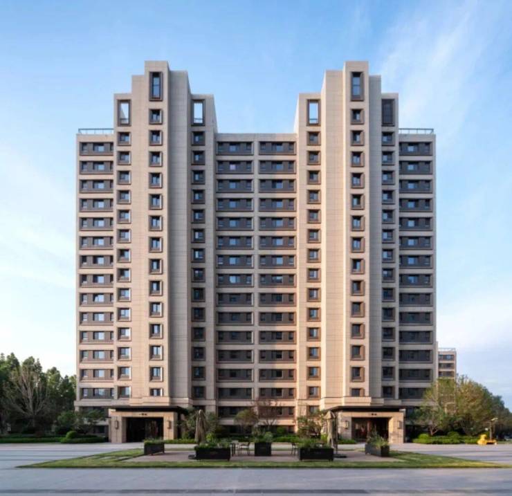 立面采用高端住宅楼盘现代典雅立面风格,设计传承了奥体金茂府古典的公建化立面,基座石材选用卡拉麦里金,不仅持久耐用且历久弥新,窗套处运用香槟金铝板切角的处理手法,通过材质的对比,彰显华贵典雅与现代时尚的立面气质。建筑色彩以暖色为主,楼座为三段式设计。