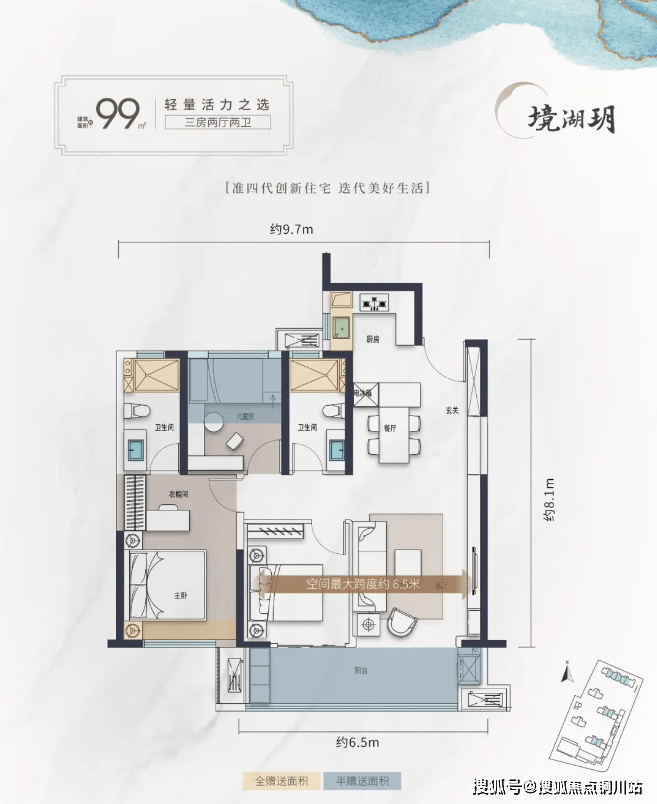 小户型也能做到大尺度:整个南向采光面可达约9.7米,其中双联大阳台开间约6.5米,主卧开间约3.4米等,这些尺度此前基本都是要建面约140平以上的户型方能实现。如今境湖玥在一套建面约99平的小户型上做到了,堪称极品。
