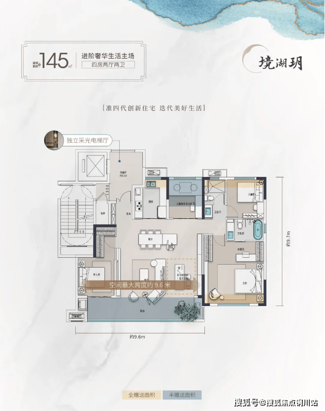 独立电梯前室:约9.7平的独立电梯前室,相当于普通户型一间房的面积了。一方面可扩充实际可用空间,作为归家过渡区使用,鞋柜、婴儿车等物件均能在此安置;另一方面还能实现内外双玄关的居住体验,私密性更强,该电梯前室还设计了较大的采光面。