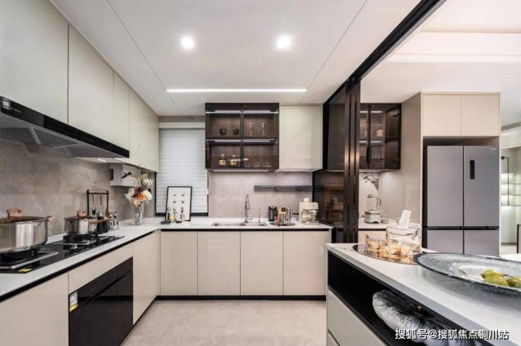 在博悦府的厨房,分段移门设计,让厨房在封闭式和开放式之间自由切换,打开后拥有了交流、聚会、娱乐等等功能,整个家的视野和氛围也相应得到了改善。