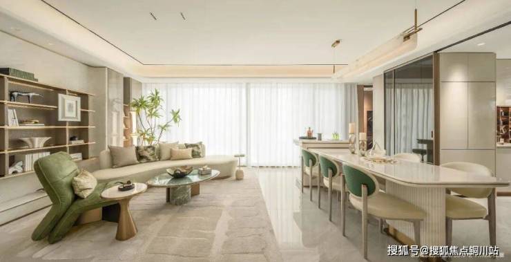 LDKB一体化洄游式横厅,面宽约6.5米,这里可以兼容儿童游戏、家庭聚餐、长辈茶叙并行不悖,让三代人共同生长。