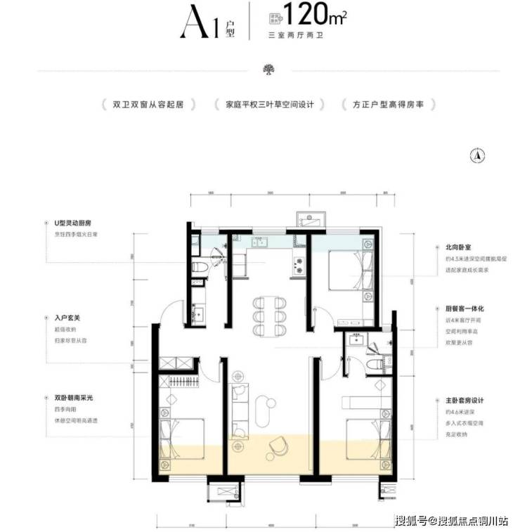 这几款户型,基本都是三叶草及其变形——客餐厨居中,卧室及玄关分列两侧,又可称「双龙抱珠」布局。