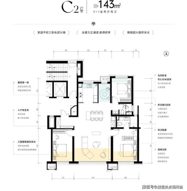 另外,像建筑面积约143㎡户型的「3+X」室布局,也非常有想象力——