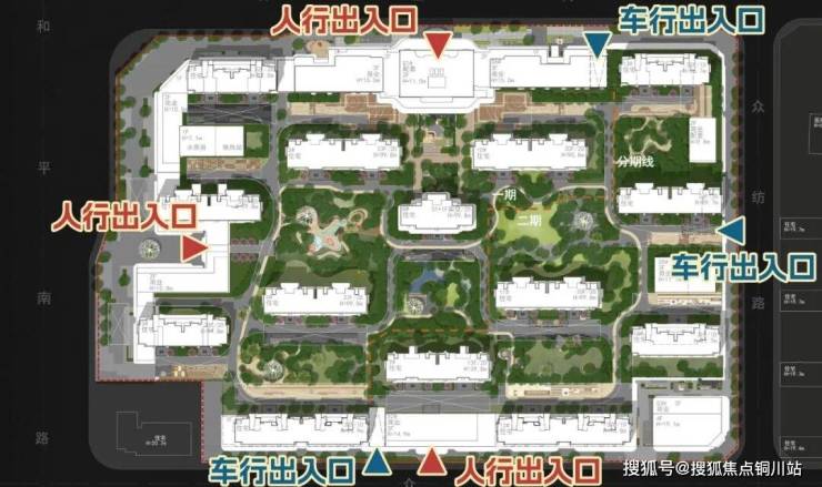 人行口除北、西侧的主、次入口外,还有1个设在南侧;车行口则位于社区东、北、西侧。实现完全人车分流。