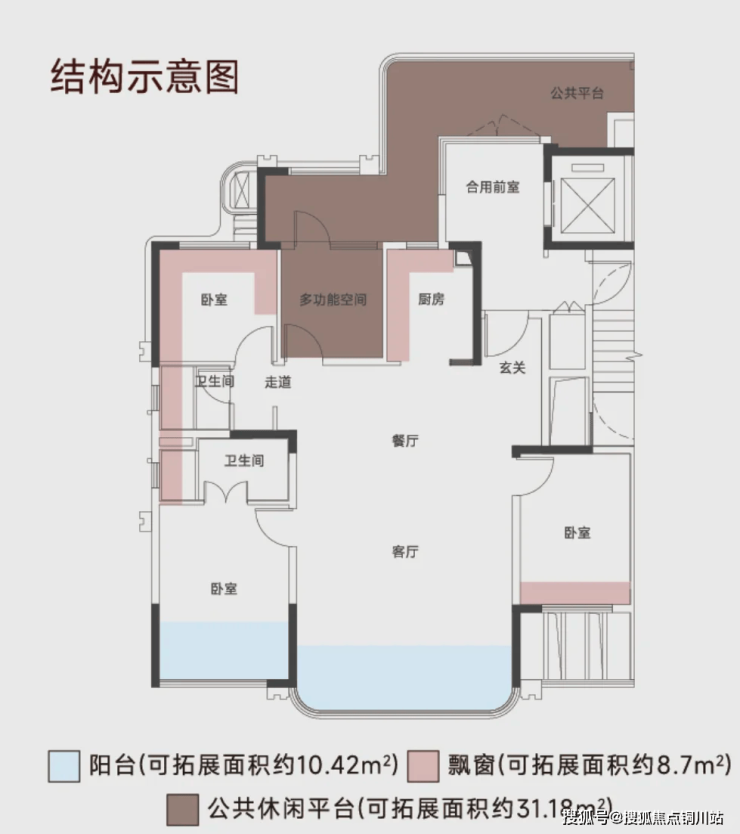 从户型图来看,项目南侧有双阳台,北侧还有大面积的公共平台不计容,可做成庭院花园或者书房,可以满足收纳晾晒和休闲娱乐的多重需求。
