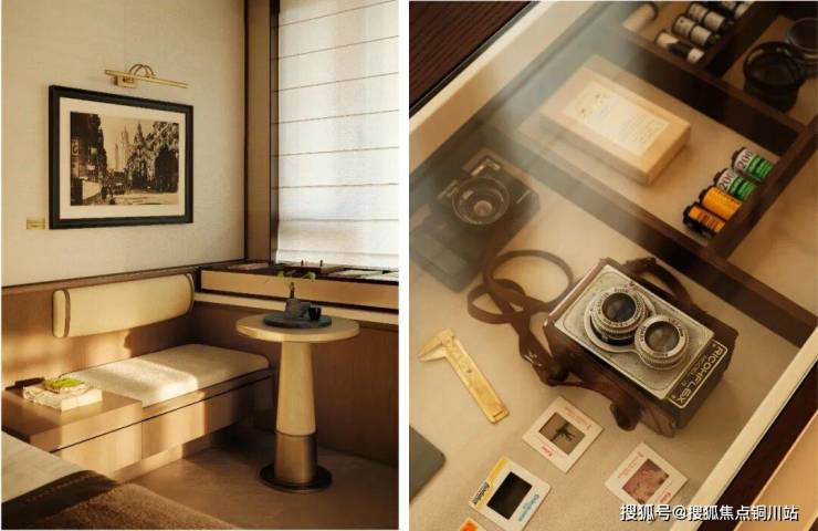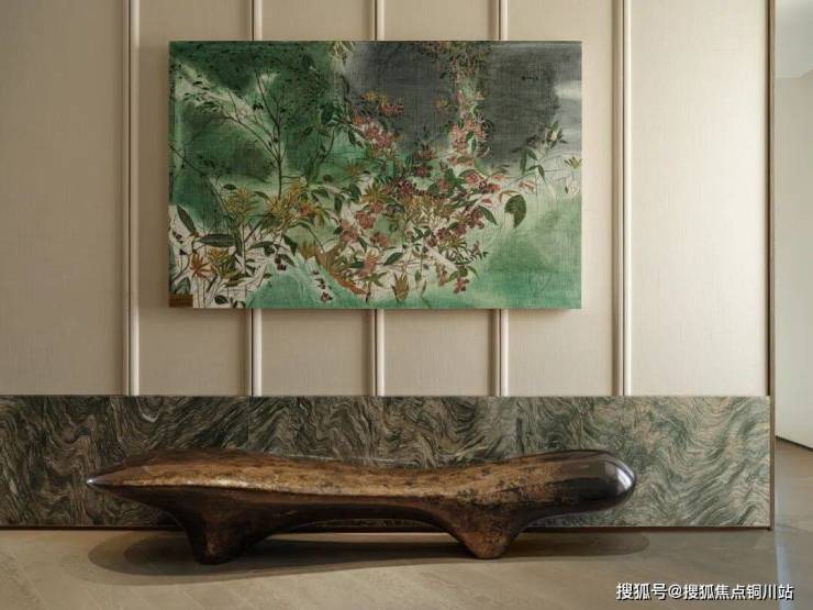 条几与墙面装置相互呼应,平滑又富有肌理的表面装饰着丰富的铜色,在灯光的映照下闪烁着独特的光泽,不由自主地联想到传统的中国山水画。