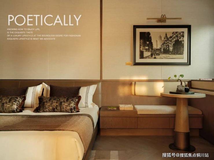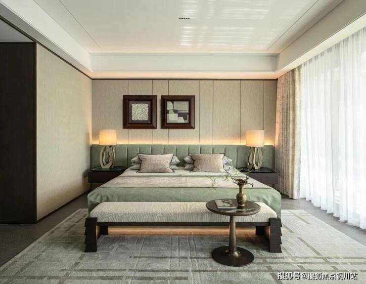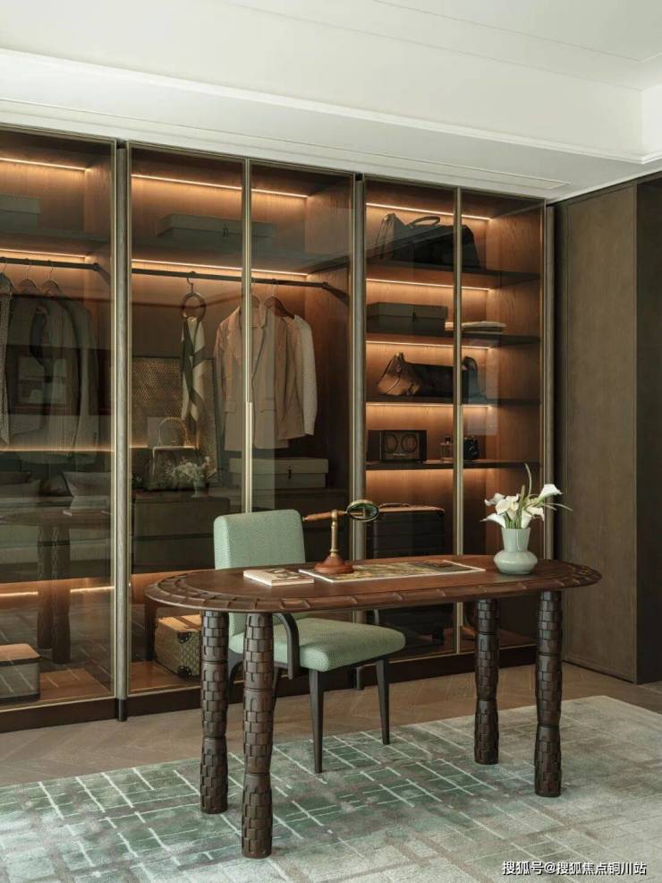 主卧以酒店套房的配置进行精心设计,书桌呈现出独特的石雕肌理,仿佛在诉说着岁月的故事。而清雅色系的搭配,为整个空间注入了一份宁静与优雅。