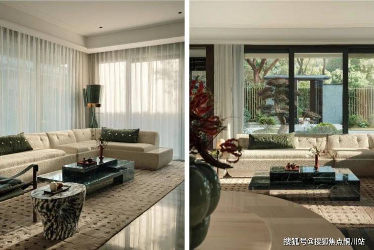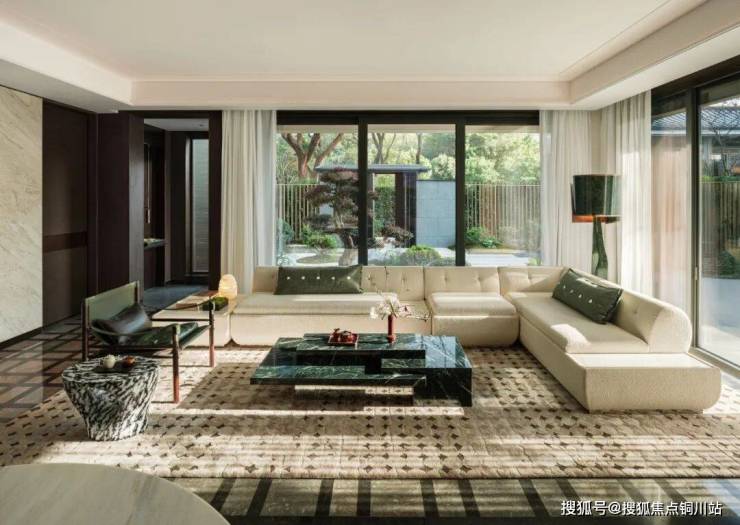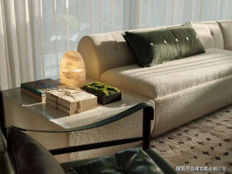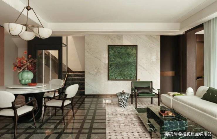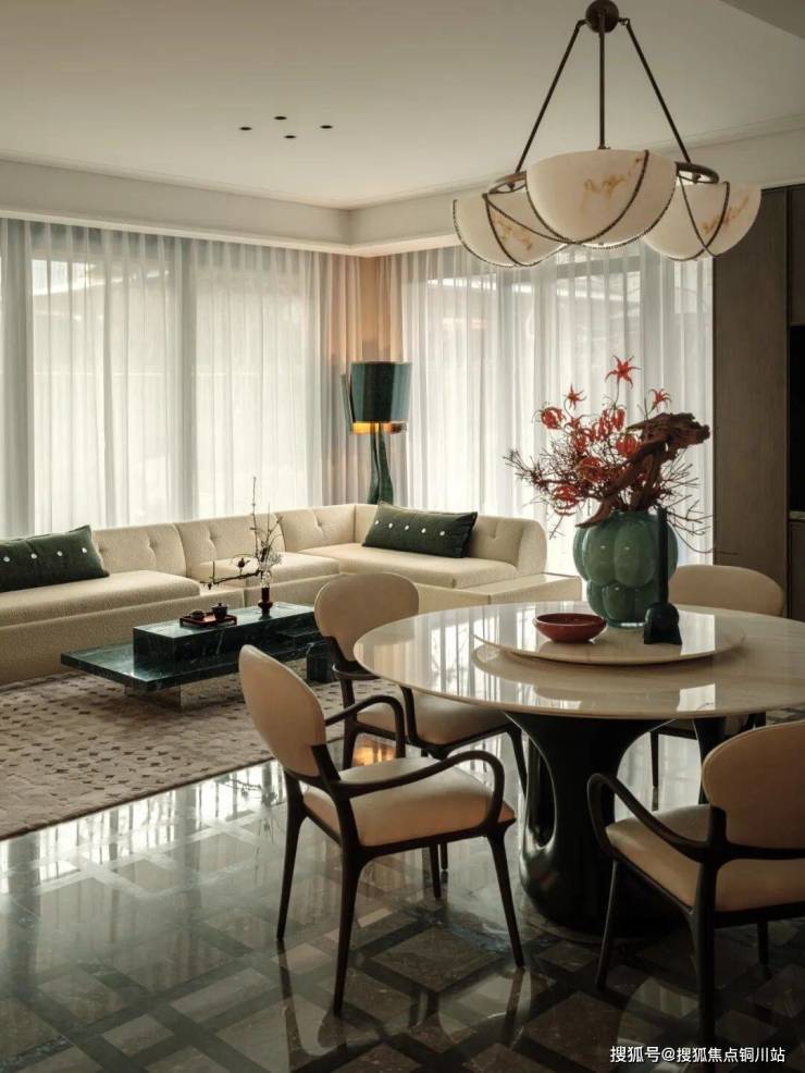 巧妙融合沙发组的极致雅致与餐厅的庄重仪式感,精心点缀以复古绿色单椅和充满现代气息的意式L形沙发。这一方空间里,时光仿佛被施了魔法,悠然沉淀,静静流淌。