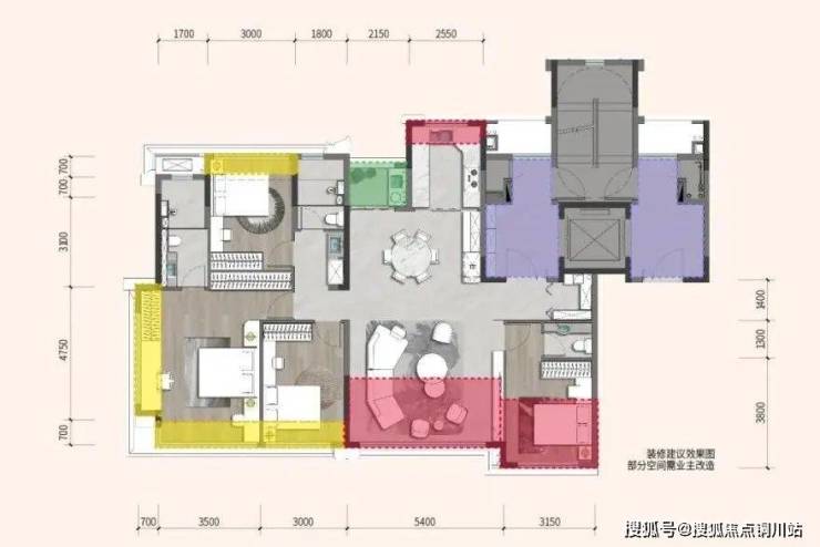 这个户型还设计了2.5个干湿分离的卫生间,可以解决南次卧半夜起夜要穿过整个客厅的困扰,非常的人性化。