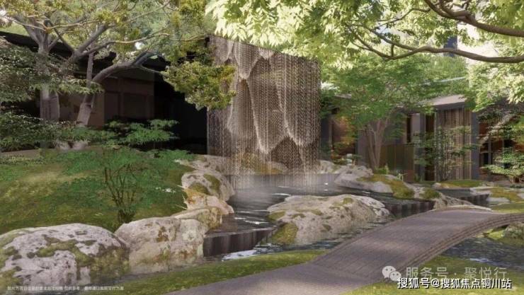集萃知足厅、玉带石桥、落差超5米瀑布等景观,选取名山原石,营造立体山水韵味