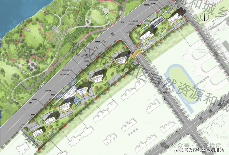 项目分为两个组团,西边组团有6栋住宅(1-3号楼、5-7号楼),东边组团有5栋住宅(8-9号楼),两个地块通过空中连廊连接。