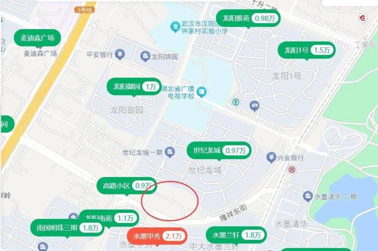2、与周边二手房价格对比,项目南向是两个别墅区,价格较高;北面世纪龙城房龄较老,均价不到1万;次新房龙阳1号的价格是相对较高的,均价1.5万,也有挂1.1-1.3万的。