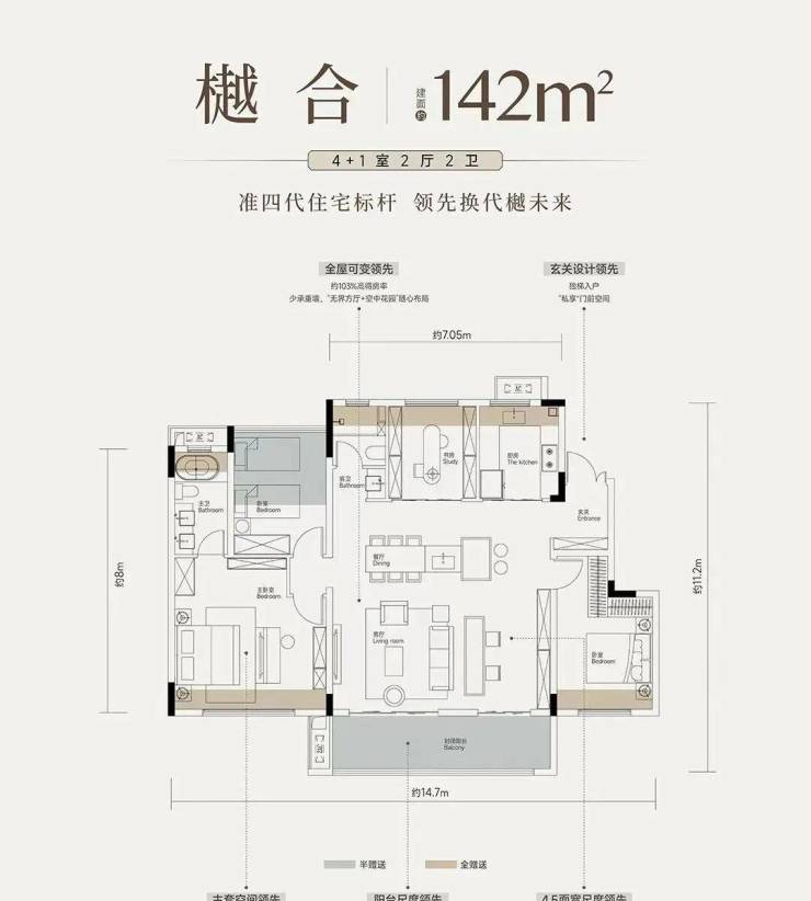 樾和户型建面约142平4+1室两厅两卫:前面有分析,南北通透,6个飘窗,2个阳台,优化面积非常多,约14.7米的南向开间,通透性和舒适度都非常高。