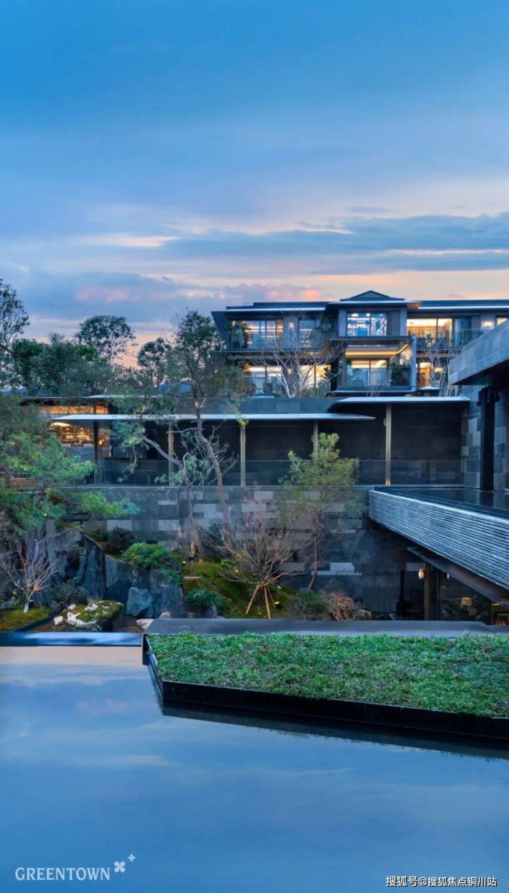 每个空间都与景观形成互动关系,书吧配备14米长、3.2米高的整面玻璃,正对瀑布景观,悬空茶亭浮于水面;泳池区域的泡池开窗借景,将外部树影引入室内。
