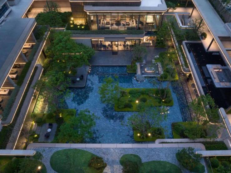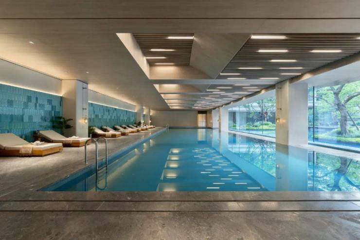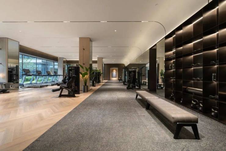在地下1层,能容纳30人同时就餐的双私宴厅,约25m*8.1m的“类无边”恒温泳池,约240㎡的专业健身房等,环绕着一座以“水院林屿”为主题的下沉式庭院。