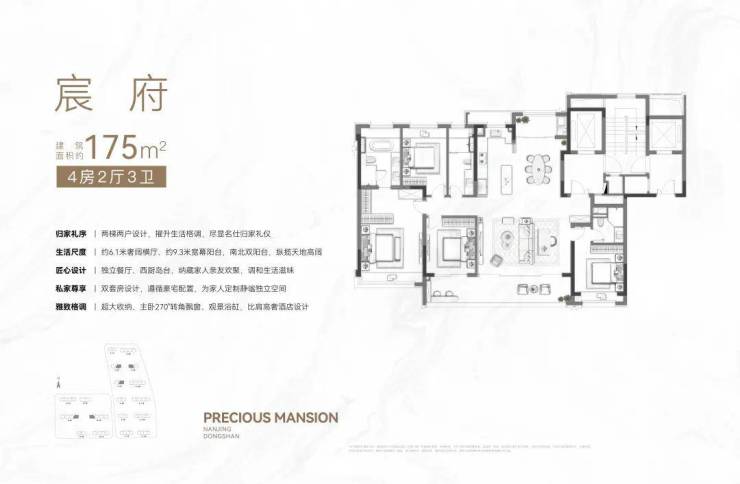 比如建面约175㎡的四房两厅三卫,南向父母套房临近玄关,更适合早睡早起、偏爱安静的老人居住。