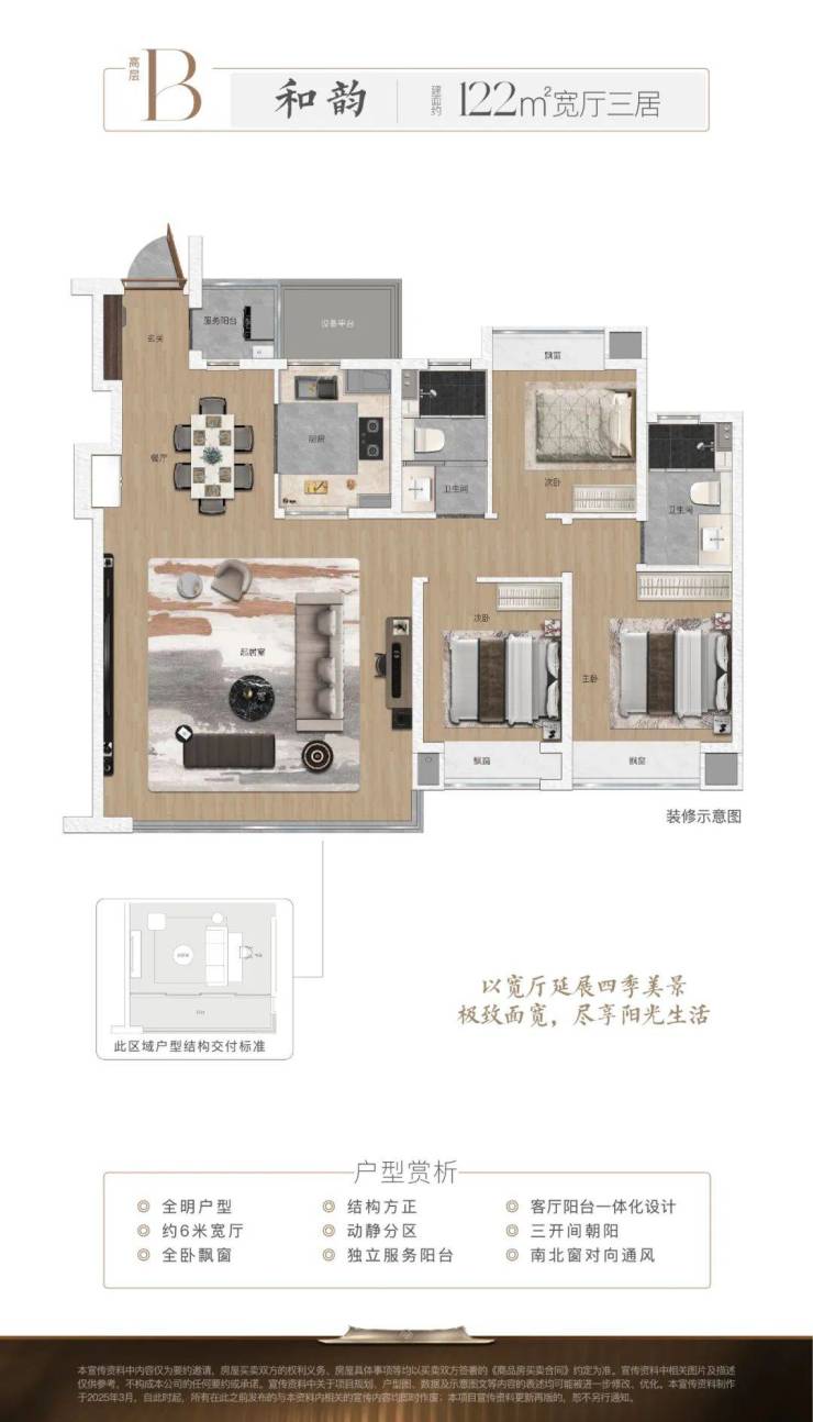 建筑面积约122㎡宽厅三居以极简纯粹美学诠释雅致生活,全明户型南北通透,三开间朝阳引光入室,全卧室配备观景飘窗。套房式主卧构筑私密休憩场域,推窗即与园林景致对话,宽厅设计打破空间界限,让阳光与清风自由流淌,于简练线条中编织出光影交织的沉浸式生活剧场。