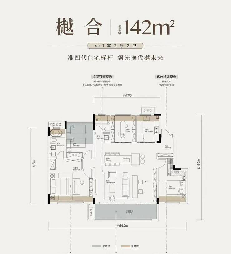 樾和户型建面约142平4+1室两厅两卫:前面有分析,南北通透,6个飘窗,2个阳台,优化面积非常多,约14.7米的南向开间,通透性和舒适度都非常高。