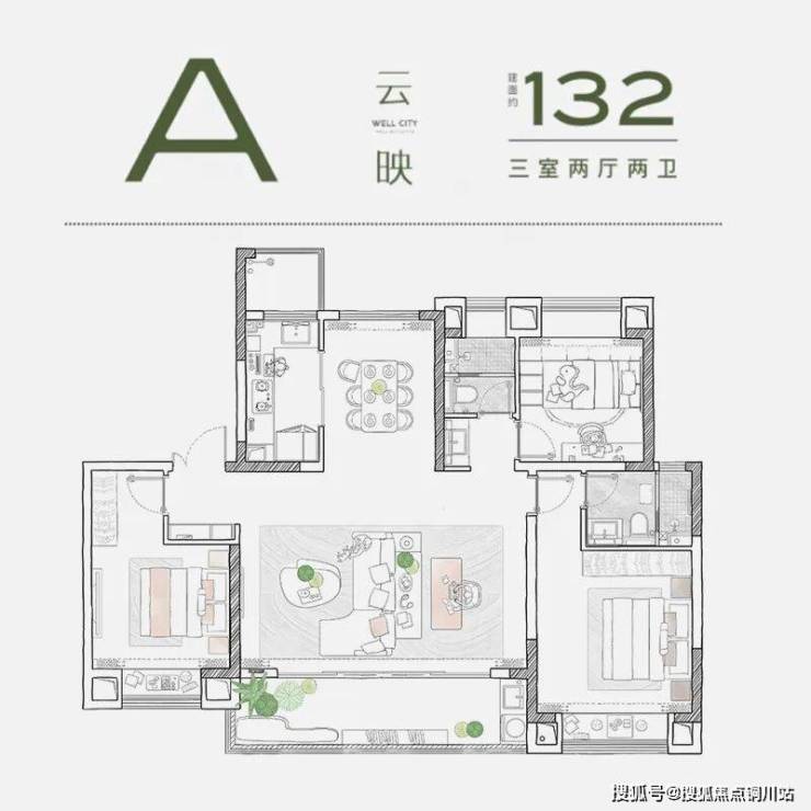 建面约132㎡改善三房,约45㎡宴会级横厅,外接开间约6.7米双联等宽阳台,形成超高包容度的家庭社交聚场,满足业主多场景匹配多角色的生活需求。