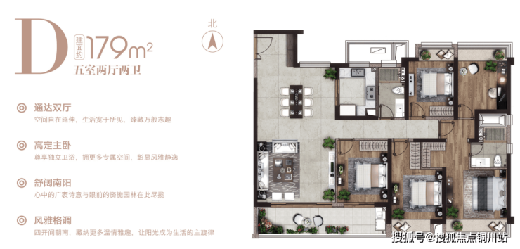 建面约139㎡:餐客厅一条化,与南向大阳台相连;朝北次卧270°转角飘窗;主卧套房,而且是南向独卫。