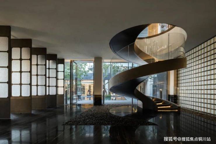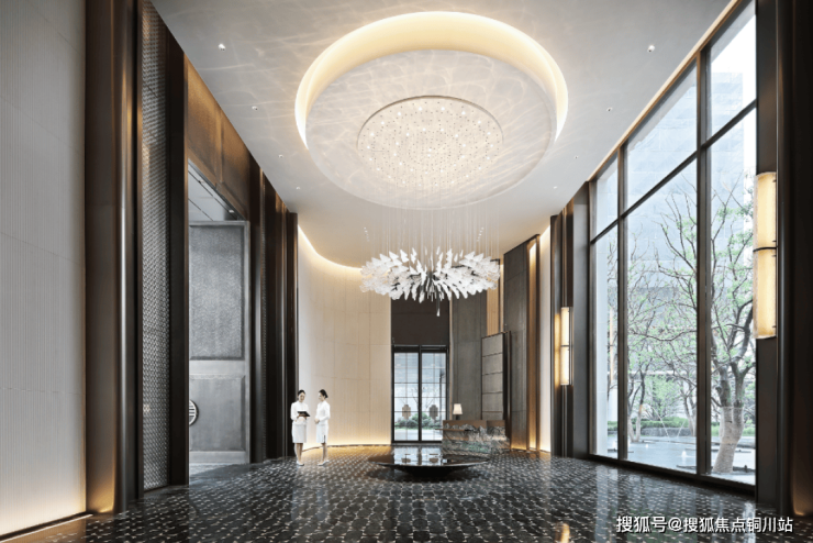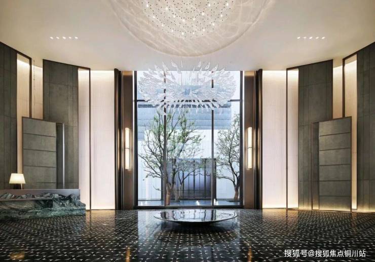 整扇大门采用铜艺精雕,以水波为纹理,两侧夹丝玻璃融入了中国传统吉祥纹“方胜纹”,演绎雅贵的隐奢。近500㎡的环岛落客前庭奢阔大气,港湾环抱式的入口景墙以及酒店式门厅,让每一次归家都能感受到高门大户的尊崇礼遇。