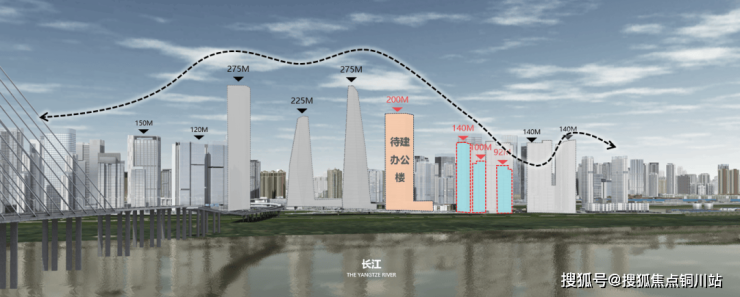 项目楼栋高度南低北高,临江视线不受遮挡;临江楼栋高度东西两侧高,中间低,形成自然的开敞空间,使得视线通廊更为通透;建筑起伏凸显主次序列,天际线连绵起伏、高低有序,空间节奏韵律丰富。