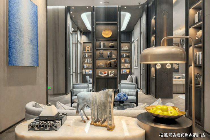 洽谈区:以木饰面与墙布为主,书柜和灯光形成静谧休闲的阅读洽谈氛围。客人仿佛置身于奢华酒店行政酒廊,营造度假般的归家氛围感和仪式感。