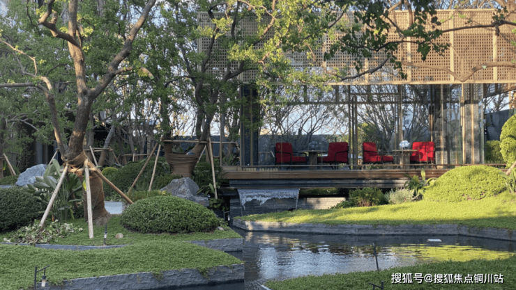 浮光水院:景观通过高差的营造,形成丰富的立体自然花园。水系勾勒空间,从会客厅的下沿缓缓流出,在乌桕林间穿梭,营造蝉鸣幽静的自然意境,以“自然共生·社交无界”为核心理念,重新定义社区交流场景。