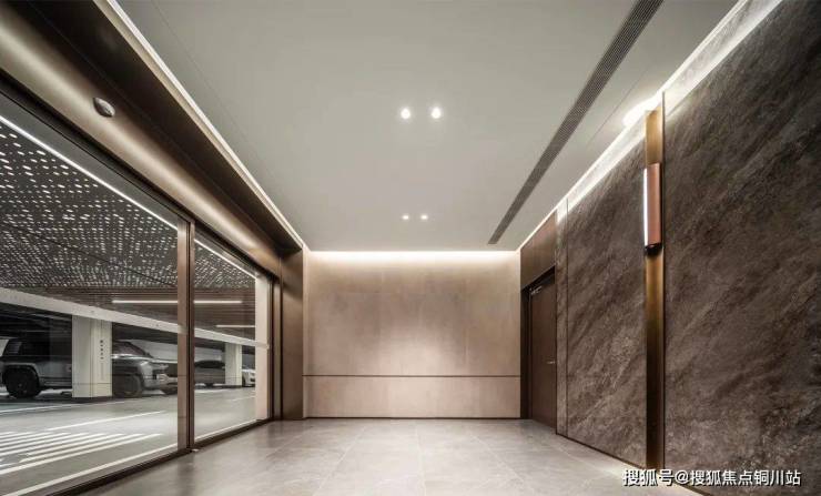 地库大堂,会所进户大堂顶面采用的是木纹铝板,带有温度的木纹与坚韧的金属相融合,质朴的纹理突显整个空间的艺术感和高级感,楼栋负一层大堂均采用星空顶的设计,熠熠生辉。