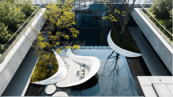 下沉休憩水院和会客亭廊形成多层次的开放空间,水景、绿植、石材搭配适宜,显露出细节感,也使得景观的意境更为丰富,营造出更多亲近自然的舒适感。