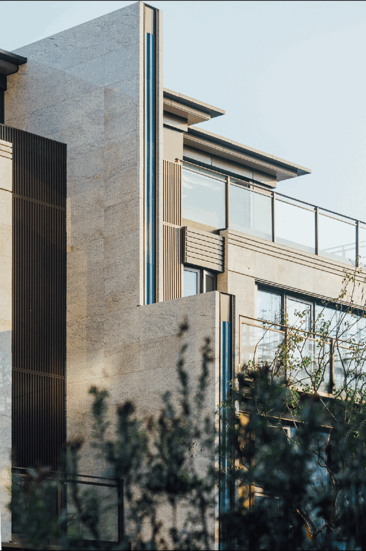 其一,别墅外立面采用大体量石材切分与全景落地玻璃,以仿铜金属板点缀,勾勒出大宅的气魄。细节处则汲取中国古建“重檐”“金镶玉”等元素,于现代肌理中透出东方意境的深远韵味;