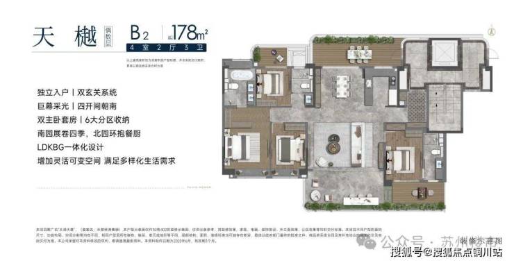 建面约178㎡户型,除了南北双花园,南北卧室也自带花园,赠送面积更大,使用率更高。