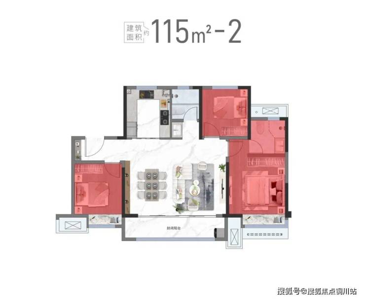 三叶草式布局是经过市场验证的经典户型格局,建面约115㎡户型通过三间卧室的分散式排布,实现“公私分区、动静分离”。主卧、次卧、儿童房分别位于户型三个角落,形成独立的居住单元。