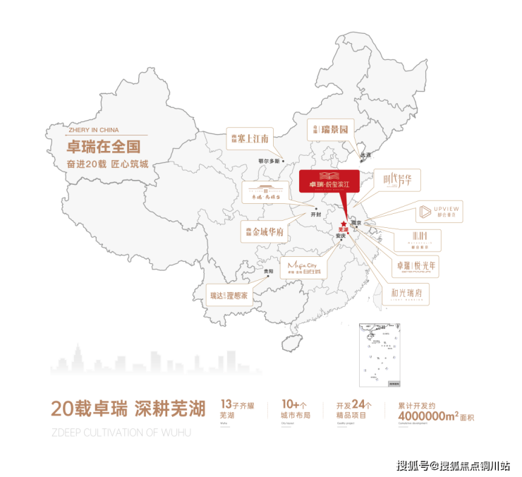 卓瑞地产,是奇瑞集团旗下子公司,具有国家一级开发资质。2003年以芜湖为战略中心,发展布局南京等10余座城市,打造24个开发项目,在城市优质地段打造优质项目。