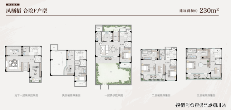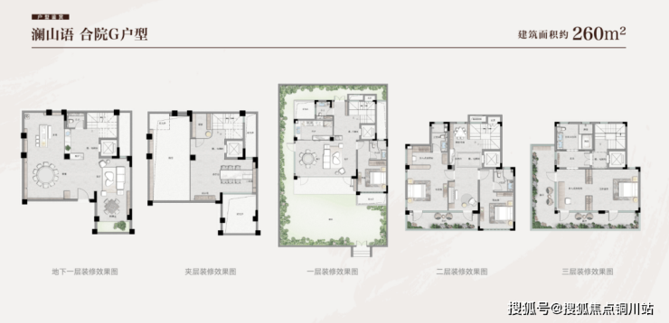 户型:建面约336-338㎡的合院(不含地下室)、约223-252㎡下叠(不含地下室)、建面约252㎡上叠(不含地下室)