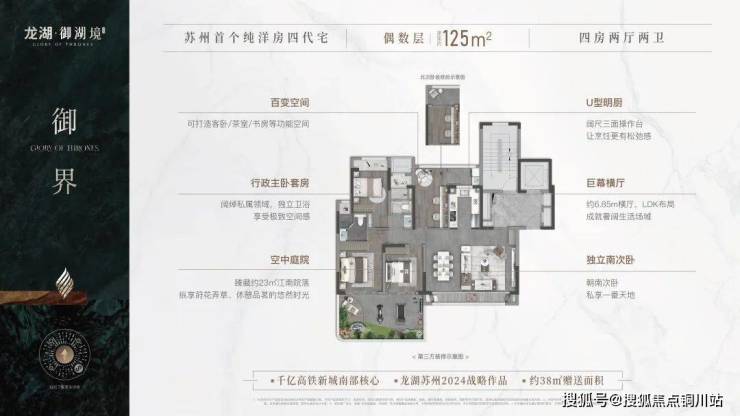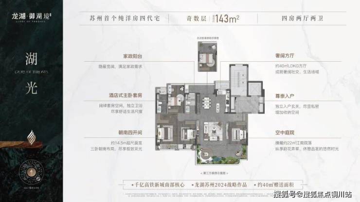 龙湖 · 未来御湖境--苏州首个第四代立体生态住宅。截止2024年1月,全国超70%的省份已在落地第四代住宅,从设计理念到工艺工法,日趋成熟,龙湖未来御湖境集大家之长,结合苏州市场,打造苏州第一个第四代立体生态住宅。项目为16栋10-11F纯洋房低密社区,将地面的庭院“搬”到空中,花园以错台分布形式,实现了高层住宅“户户有花园”。项目总建筑面积124482.08平方米(未含露台部分面积),总计容面积82950.40平方米,容积率1.6,绿地率37%,建筑密度24.98%。空中庭院面积达约20-50㎡,均约6m挑高,最大270°转角视野。