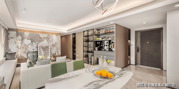 一方餐客厨无界一体的家庭交流公区,孩子的玩具、父亲的茶席、母亲的瑜伽垫可以和谐共处,同时与约5.4米观景飘窗无缝连接,将冬日清晨的暖阳和风景一并邀入室内,在这方足够开阔的空间,承载家人之间无隔阂的陪伴,亲友欢聚一堂,尽享温情与暖心时光。